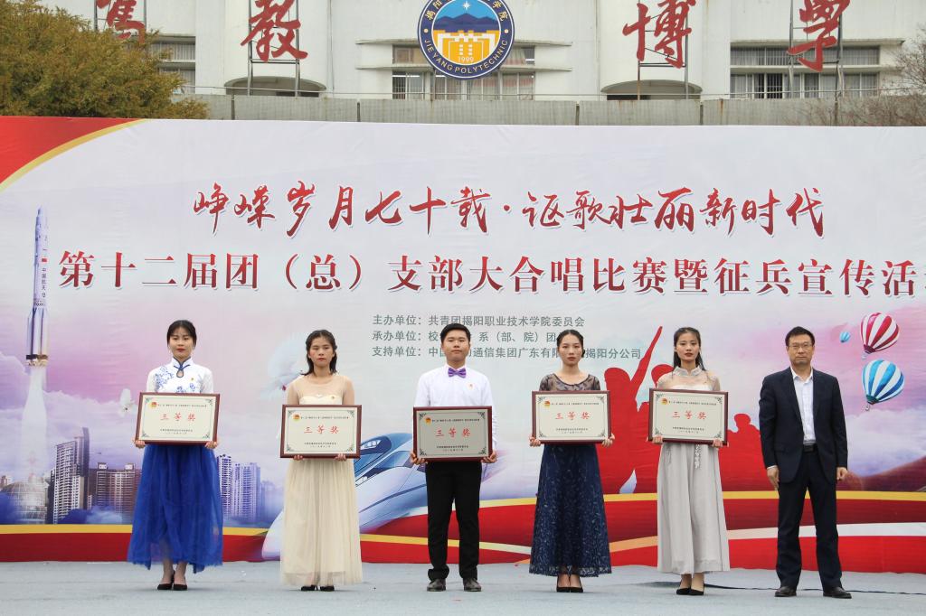 经过评委公平公正的评分,退伍军人队伍、外语系获得了一等奖;生物工程系、信息工程系、师范教育系代表队获得了二等奖;机电工程系、电子商务创业学院、经济管理系、化学工程系、艺术与体育系代表队获得了三等奖;江芷娴、林蓓盈、李秀娟、傅特鹏四位同学获得了最佳指挥奖。