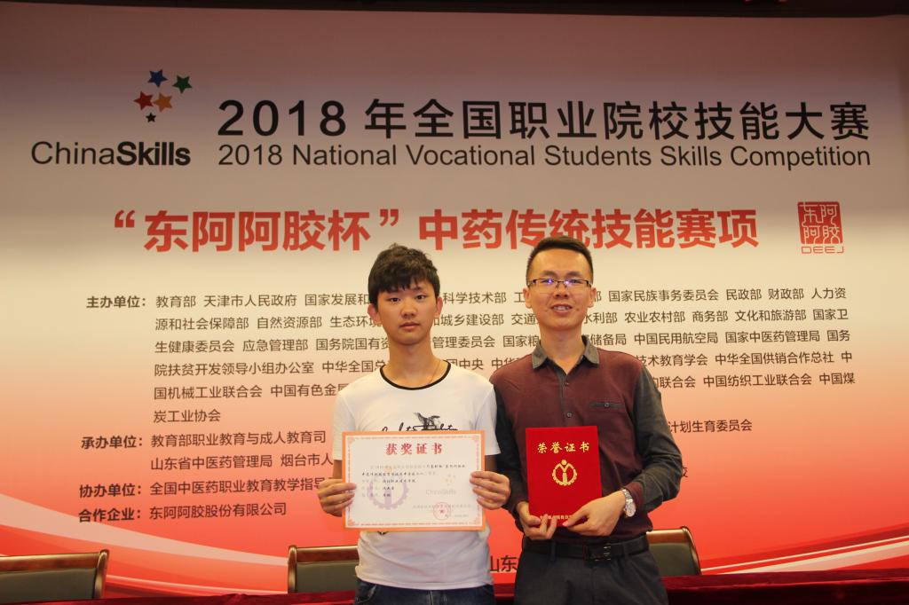 5月30日-6月1日,2018年全国职业院校技能大赛高职组中药传统技能赛项在山东中医药高等专科学校举行,mg4355官网选手沈杰鑫在生物工程系廖鹏等老师指导下,与来自全国各地27个省市的69所兄弟学校115支参赛队伍同台竞技,最终喜获国赛三等奖,这是mg4355官网参加全国职业院校技能大赛以来首次取得国赛奖项,实现零的突破。