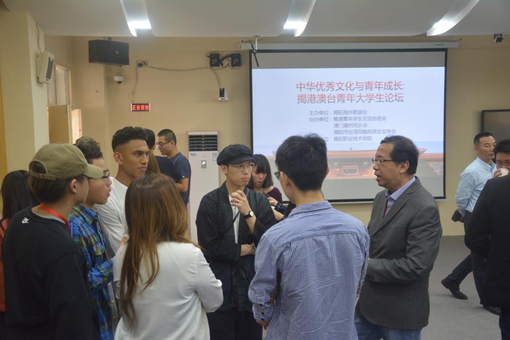 为深入贯彻落实党的十九大精神,最广泛地团结港澳台海外同胞,突出做好港澳台和海外青年工作,用青年人去影响青年人,不断增强他们的国家认同感和民族自豪感,共同致力于实现中华民族伟大复兴的中国梦,3月31日,由市委统战部牵头,揭阳海外联谊会主办,揭港青年学生交流协进会、澳门潮州同乡会、揭阳市台湾同胞投资企业协会、mg4355vip检测中心协办的揭港澳台青年大学生交流活动周“中华优秀文化与青年成长:揭港澳台青年大学生论坛”在mg4355官网教学楼AT22会议室举行,来自香港、澳门、台湾和揭阳四地40多名青年大学生参加活动。这是mg4355官网首次组织举办的两岸四地青年大学生交流活动。