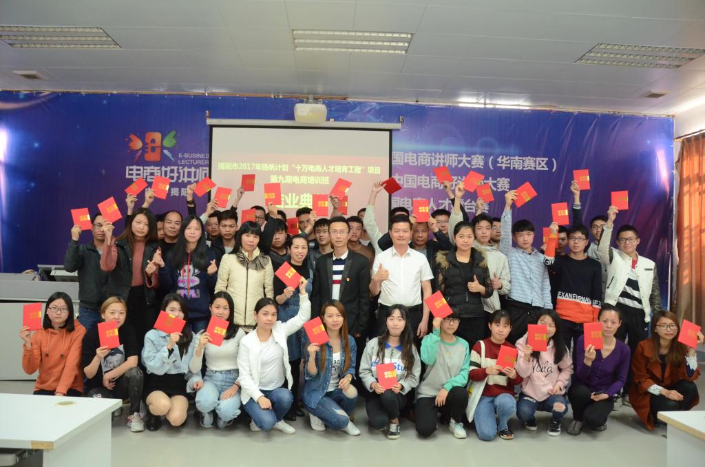 3月23日,由mg4355vip检测中心与揭阳市源创职业培训学校联合举办的揭阳市2017年扬帆计划“十万电商人才培育工程”项目第九期电商培训班在军埔电商村圆满结束,并于当日下午举办结业典礼。