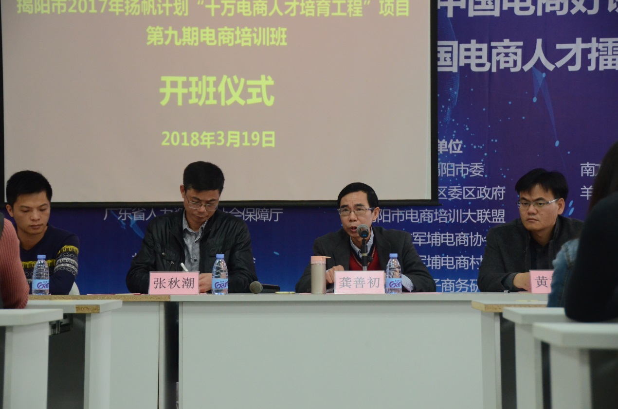 为深入贯彻党的十九大精神,进一步推动产教融合,深化校企合作,实行精准对接、精准育人的人才培养模式,mg4355vip检测中心与揭阳市源创职业培训学校联合举办的揭阳市2017年扬帆计划“十万电商人才培育工程”项目第九期电商培训班今天上午在军埔电商村正式开班。龚善初院长出席开班仪式并讲话。