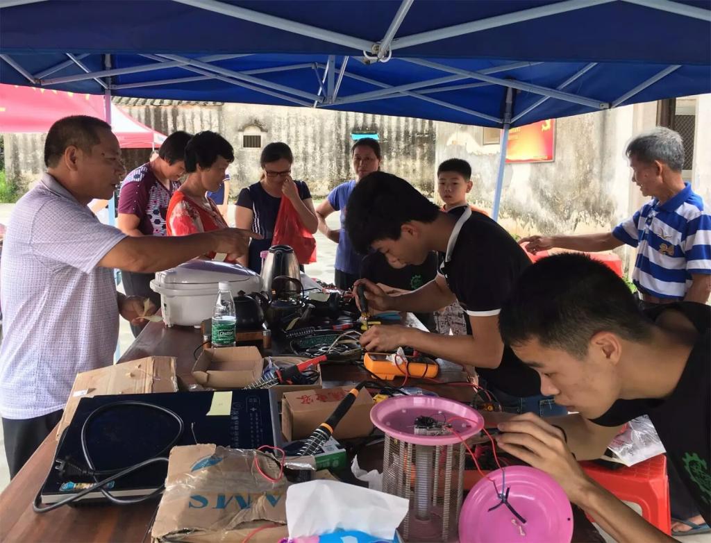 五、开展义务维修家电服务。机电工程系黄旭銮老师和校团委孙芬兰老师带领“美丽乡村实践队”前往揭西县和普宁市乡村开展家电义务维修、科普宣传和问卷调查等社会实践活动。同学们运用专业知识与技能,认真仔细地进行家电检查维修工作。同时,通过分发宣传册,现场解答等形式,向广大群众宣传科普知识,特别是安全用电常识,以及一些基本的电器知识、保养及维护方法,并对群众提出的一些疑问给予了细致耐心的解答。